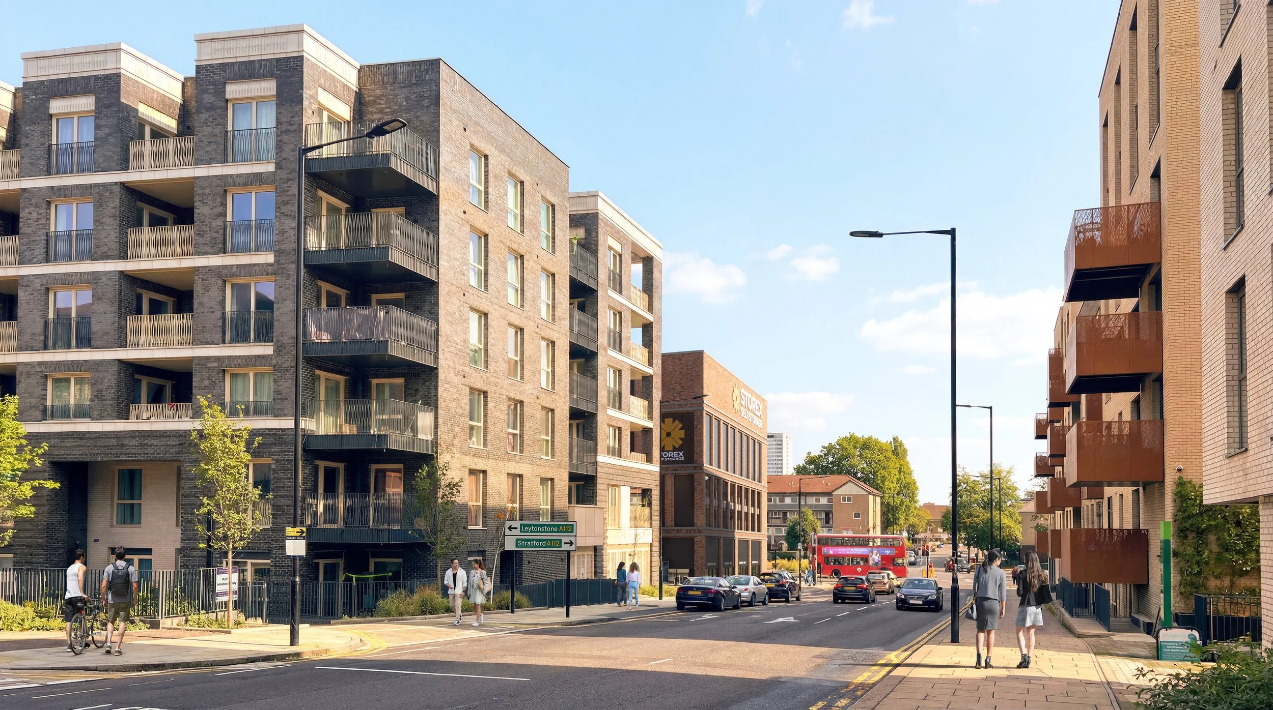 The primary elevational considerations focus on the Penny Brookes Street and Leyton Road frontages, given their prominence within the streetscape. The proposed elevations take cues from the Chobham Farm masterplan, forming a coherent urban block with a clear and active frontage along both streets. This approach reinforces the evolving, regular street pattern envisioned in the masterplan.
